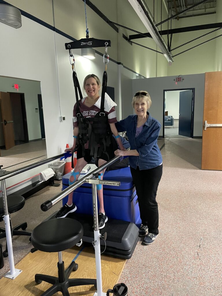 Before I could even attempt the system, my therapist, Amber, would ready me with the care and precision of a pilot prepping for flight. I’d lie flat on a table while she fastened a rock-climbing-style harness around me, sliding towels under the straps to cushion the pressure. She’d secure each strap with the strength of a pitbull and then repeat the ritual for good measure. Then came the transfer back into my wheelchair so I could access the ZeroG. Hearing the click signaled I was hooked into the ZeroG system and ready to go!